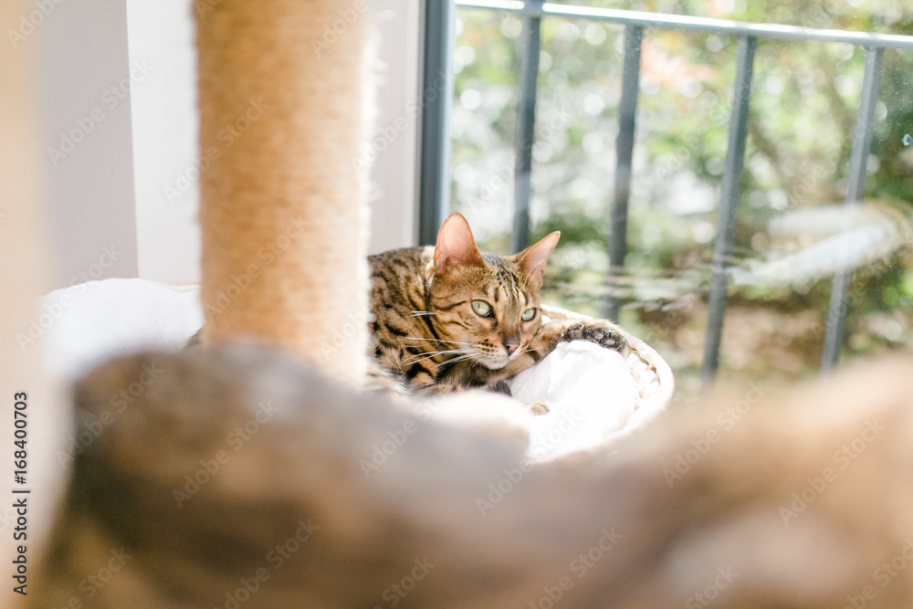 Bengalkatze Katze im Kratzbaum in der Sonne