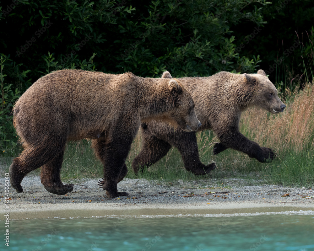 Mother and year old cub walking lakeside