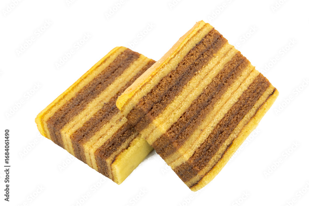 View of two slices of traditional Indonesian lapis legit cake. The slices are stacked diagonally, showcasing the intricate alternating layers of golden-yellow and chocolate-brown.
