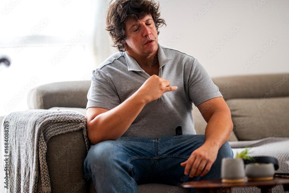 40-Year-Old Man Feeling Hot with Pointing Gesture on Sofa