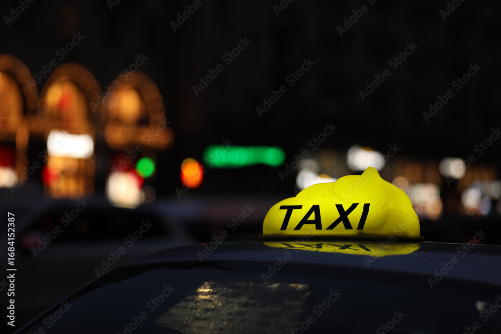Taxi car with yellow checkered sign on city street in evening, closeup