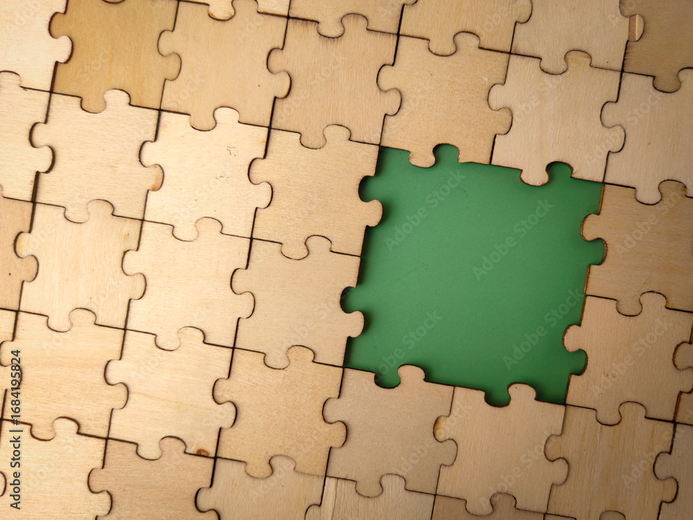 The image shows a jigsaw puzzle with one piece missing, revealing a green surface beneath
