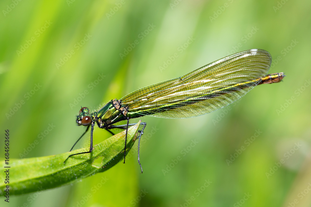 Close-up of a banded damselfly (Calopteryx splendens) sitting on a blade of grass. The background is blurred and green. The wings are clearly visible.