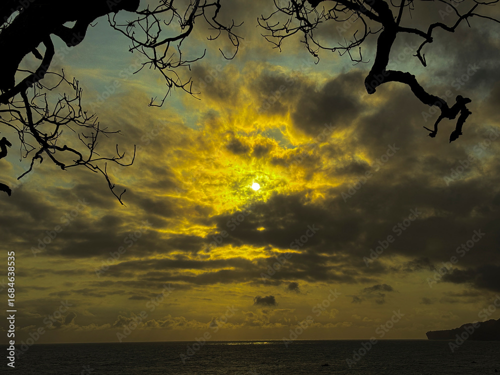 Golden Sunset at Sea: A breathtaking view of a golden sunset over the sea, framed by dark, bare branches. The warm sunlight pierces through dramatic clouds, creating a mesmerizing natural spectacle.