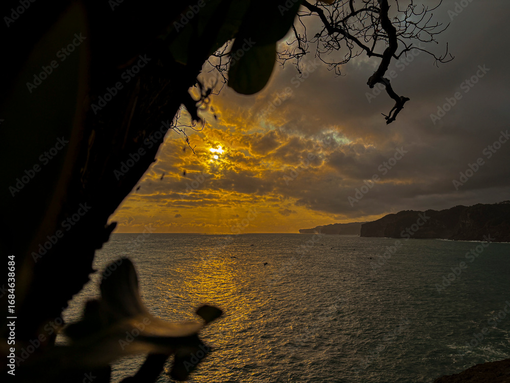 Golden Sunset Over the Sea: A breathtaking view captures the golden sun setting over the tranquil sea, framed by silhouetted branches and the gentle silhouettes of coastal formations.