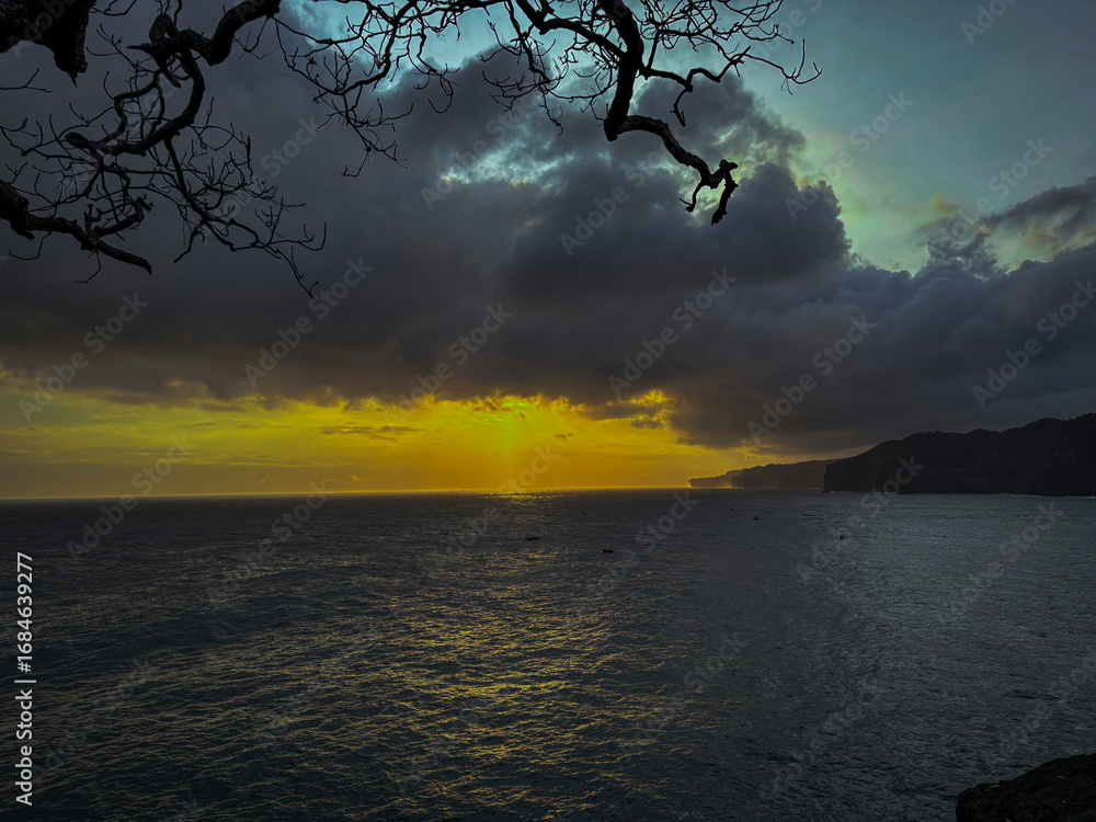 Ocean Vista Under Dramatic Sky: A breathtaking coastal scene as the sun dips below the horizon, painting the sky with fiery hues of yellow and orange and reflecting off the tranquil waters.