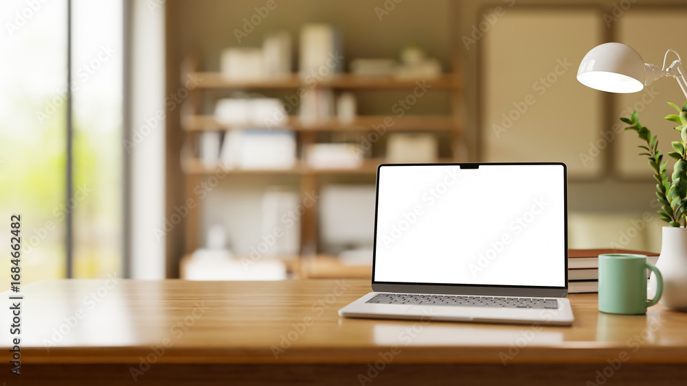 Modern laptop with blank white screen on wooden desk in cozy home office interior