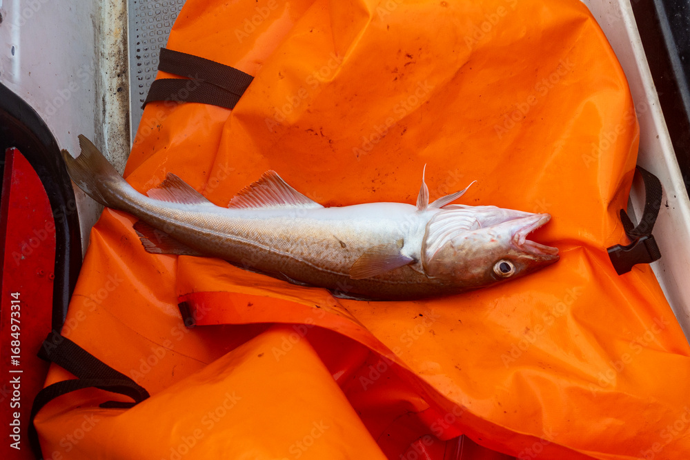 A fresh cod lies on an orange tarp inside a fishing boat. The scene captures the excitement of fishing early in the morning on the open water.