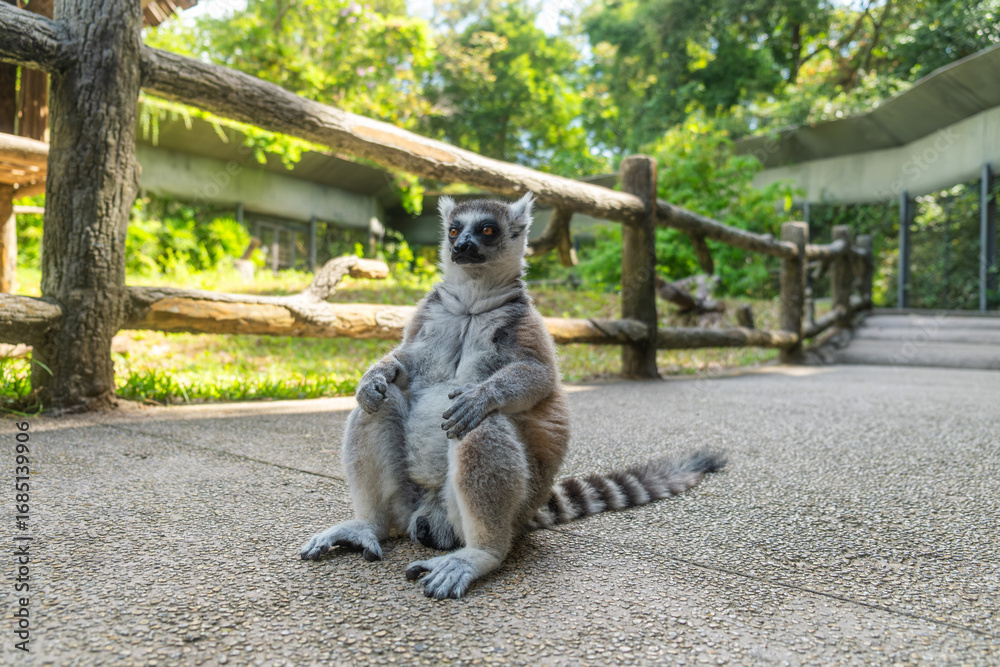 Ring tailed lemur sitting upright on pathway in safari park surrounded by greenery on Phu Quoc island, Vietnam. Biodiversity and wildlife observation. Tropical conservation and sustainable tourism