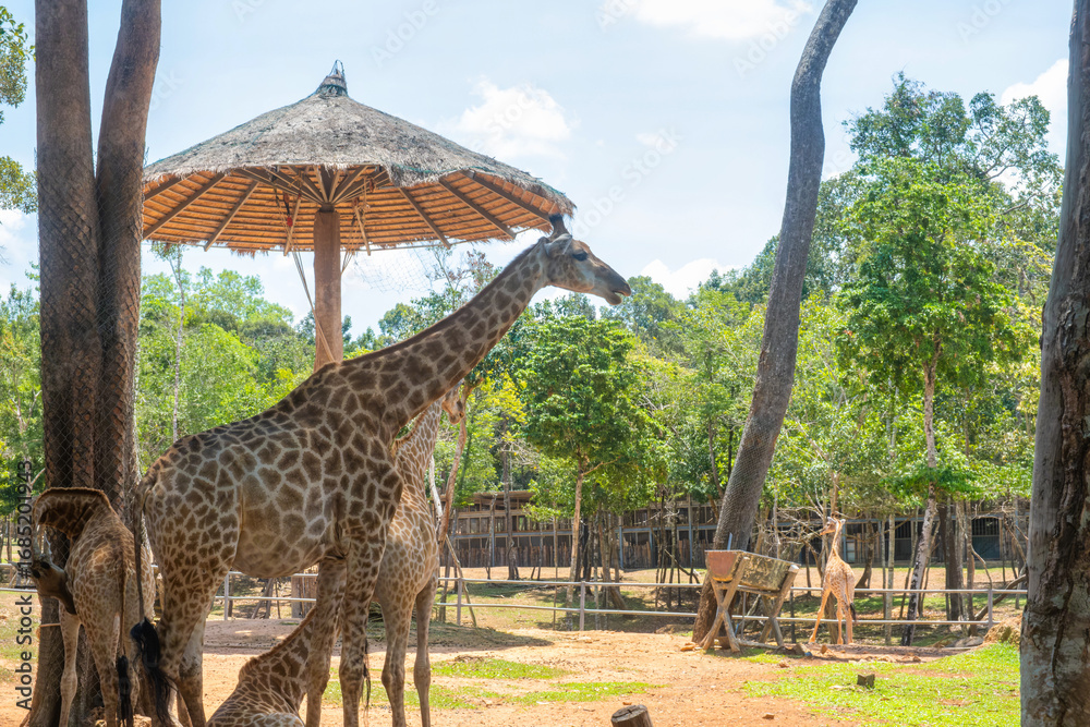 Group of giraffes standing and feeding under a thatched shelter in safari park on Phu Quoc island, Vietnam. Wildlife interaction. Tropical conservation and sustainable tourism in Asia