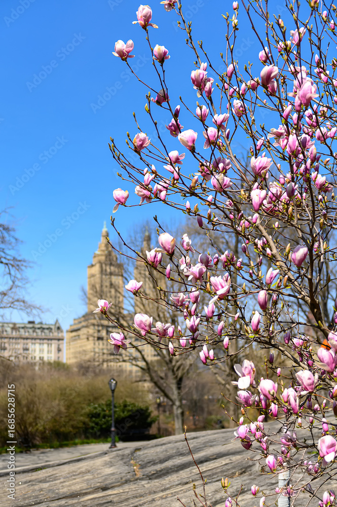 Spring magnolias in Central Park. Pink magnolia flowers bloom against a bright blue sky in Central Park, marking spring's vibrant arrival in NYC.