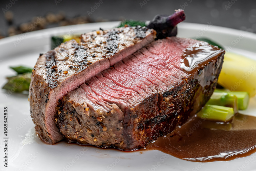 Tender beef steak with rich sauce served. A perfectly cooked beef steak is plated, showcasing juicy pink interior and rich brown sauce, garnished with vegetables.