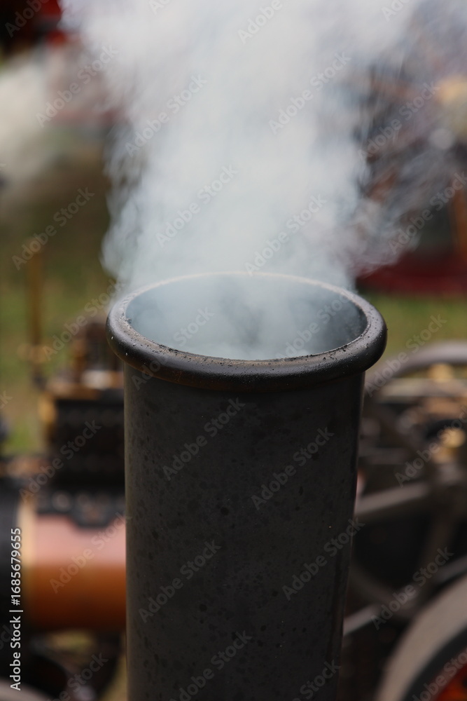 Aus dem Kamin einer Dampfmaschine strömt Rauch nach oben