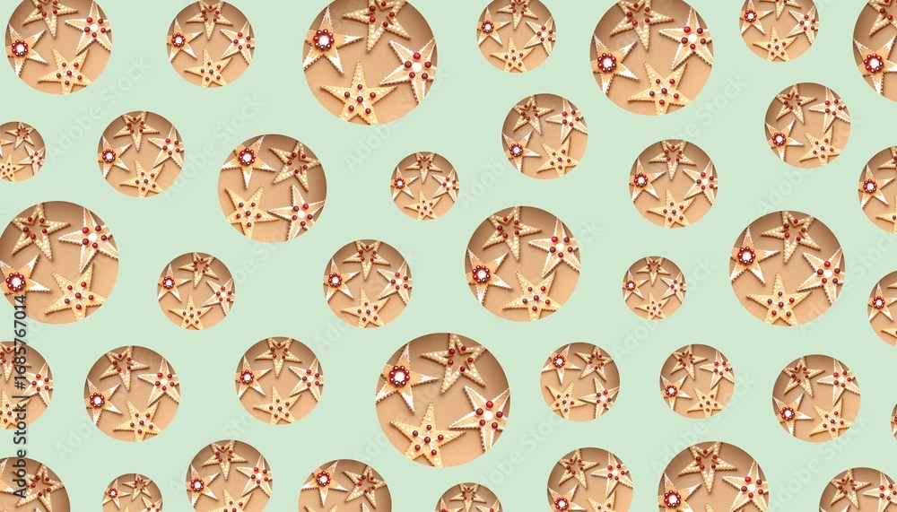 Cookie patterned backgrounds, cookie cutter week concept. Seamless cookie pattern. Round shape. Modern poster, banner, Christmas holidays. Baking Christmas cookies. Food, sweets, mint color background
