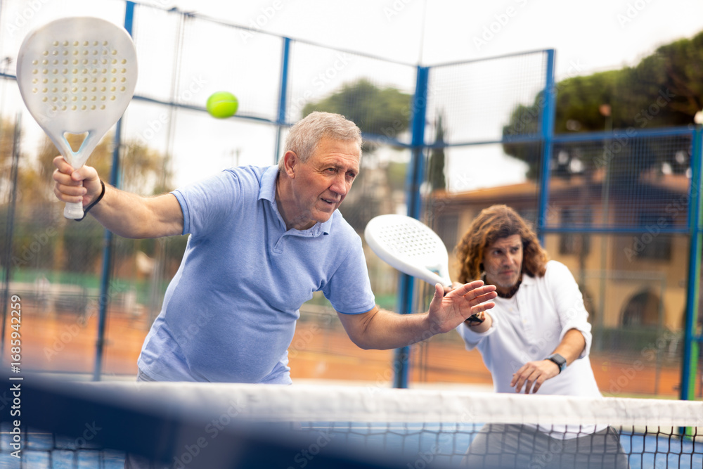 Focused aged man playing friendly paddleball match on outdoor summer court. Senior people sports concept..