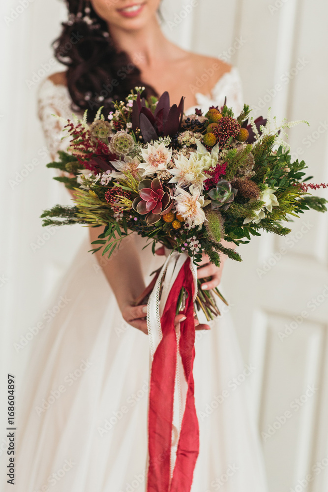 Wedding brides dress and grooms suit hang on decorative branch