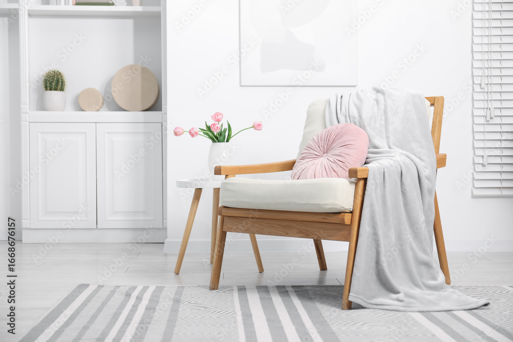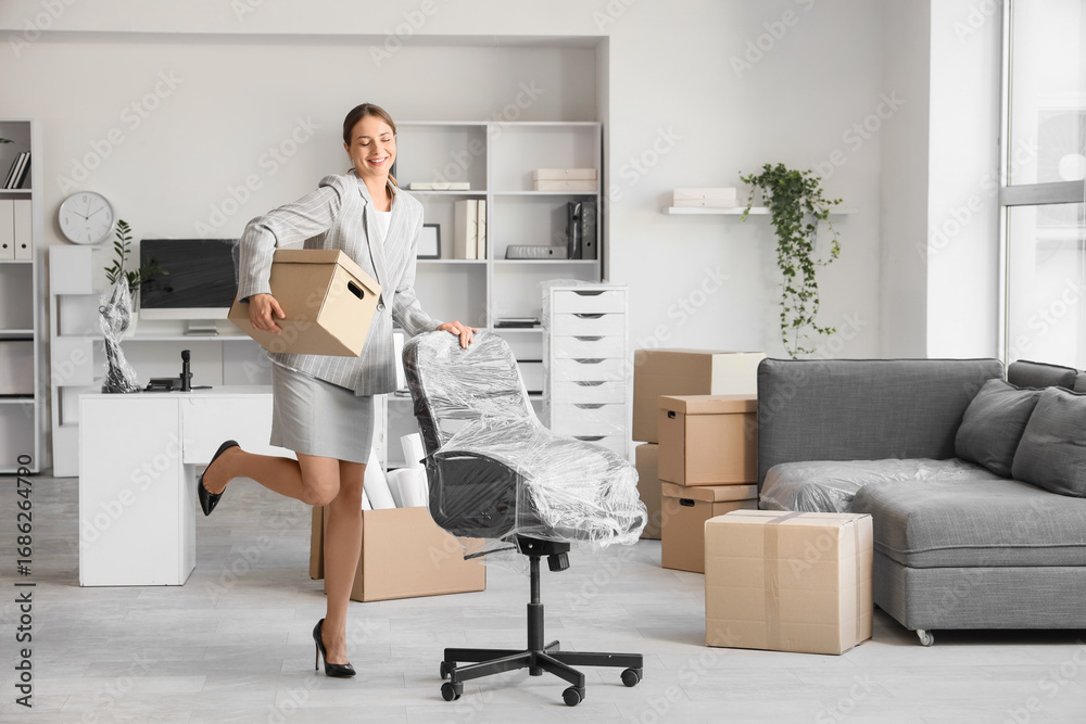 Young happy businesswoman with cardboard box of belongings and wrapped armchair in office on moving day