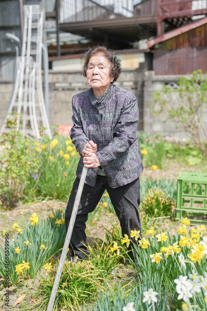 An elderly woman is standing in a garden with a green watering can. She is holding a long stick and she is tending to the flowers. Concept of calm and peacefulness