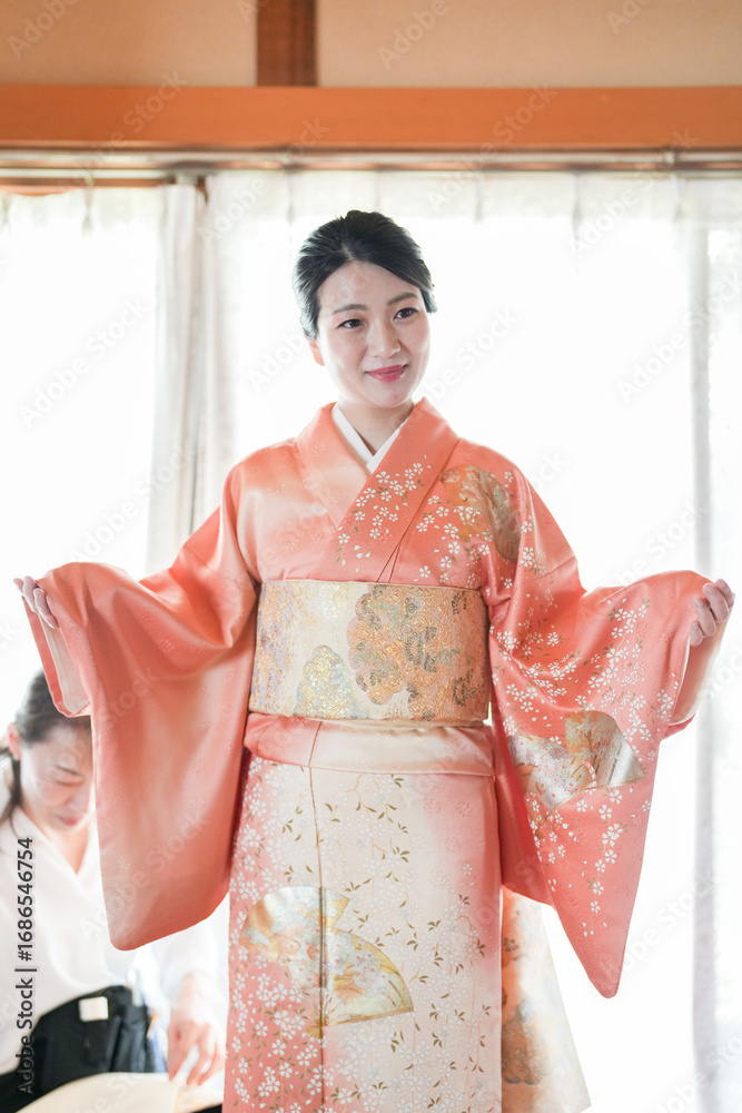 A woman in a pink kimono is posing for a picture. The kimono is decorated with flowers and has a gold trim. The woman is smiling and she is happy. Scene is cheerful and lighthearted