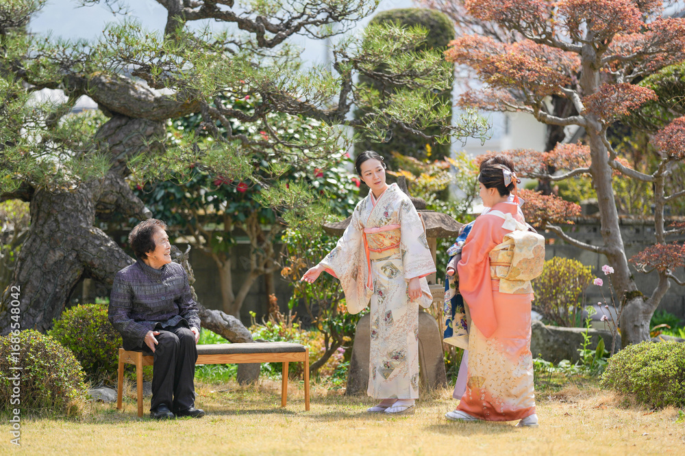Three women in traditional Japanese clothing are standing in a garden. One of them is sitting on a bench