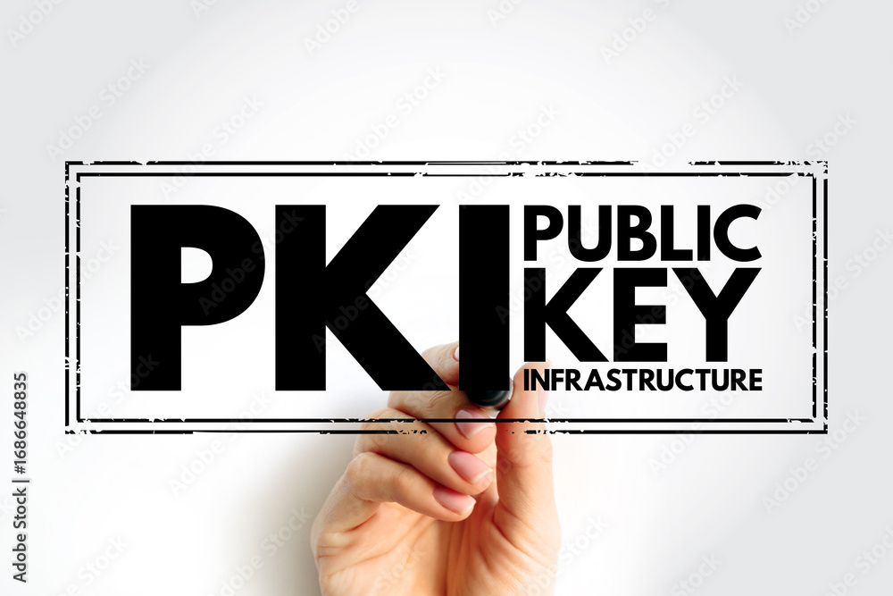 PKI - Public Key Infrastructure is a set of roles, policies, hardware, software and procedures needed for digital certificates and manage public-key encryption, acronym stamp concept background