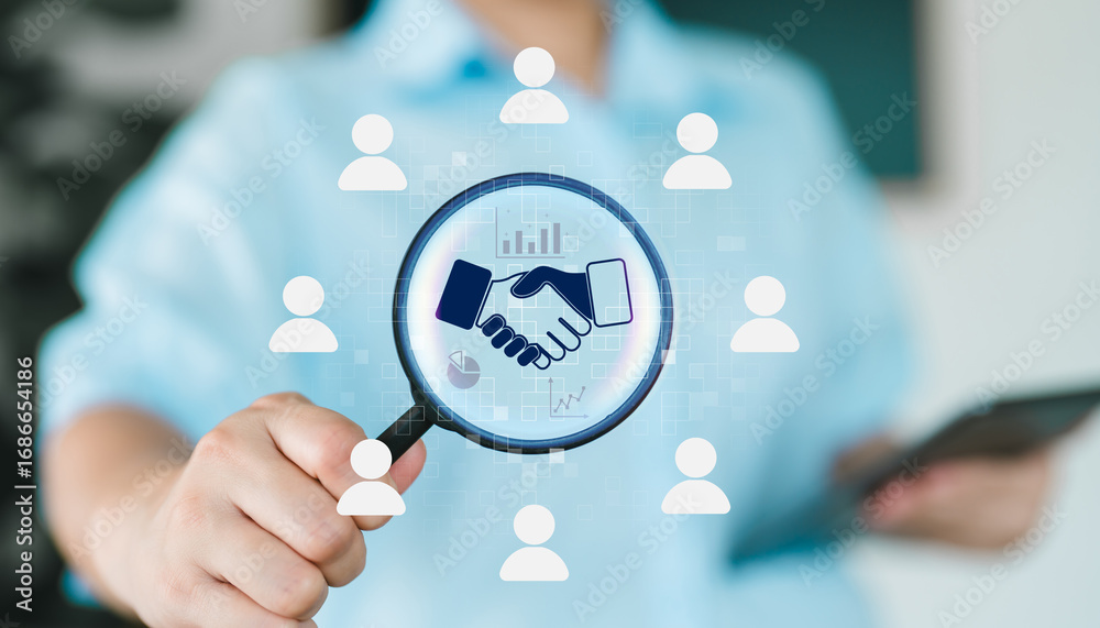 Businesswoman holding magnifying glass with handshake icon, business partnership, client relationship, recruitment, teamwork, networking, customer targeting in digital marketing and HR strategy.
