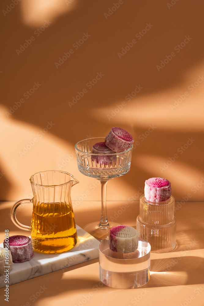 Homemade Chinese snow skin mooncakes. Snowy Moon cakes on a White Background. traditional Asian desserts for Mid-Autumn Festival and seasonal celebrations