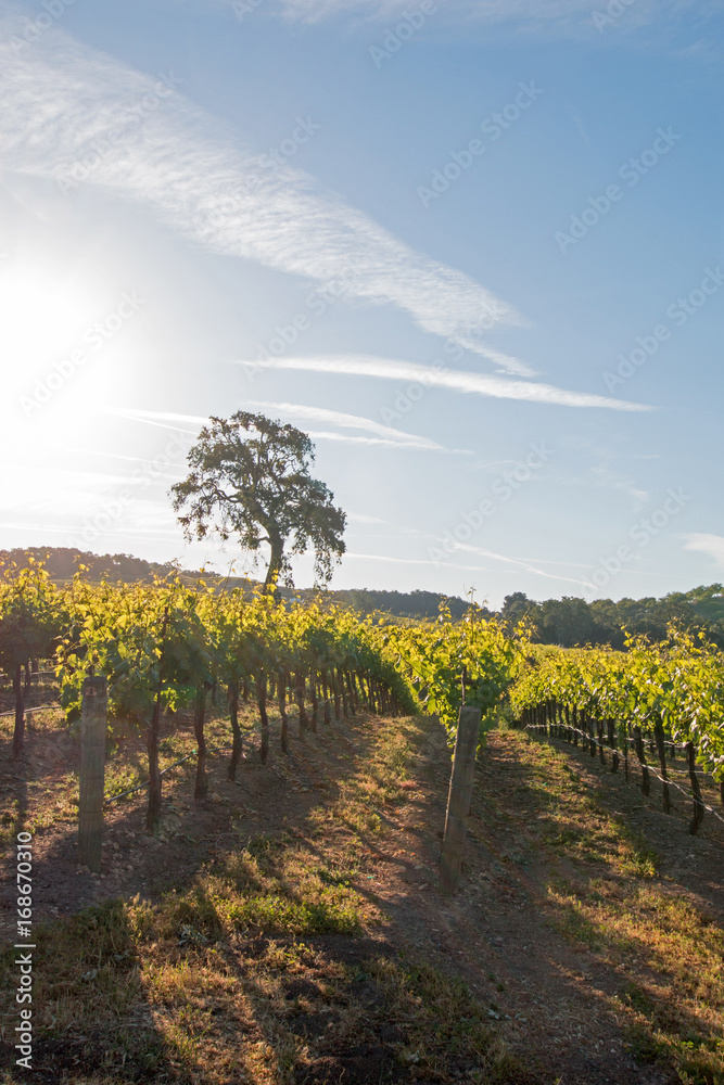 California Valley Oak tree in vineyard at sunrise in Paso Robles vineyard in the Central Valley of California United States