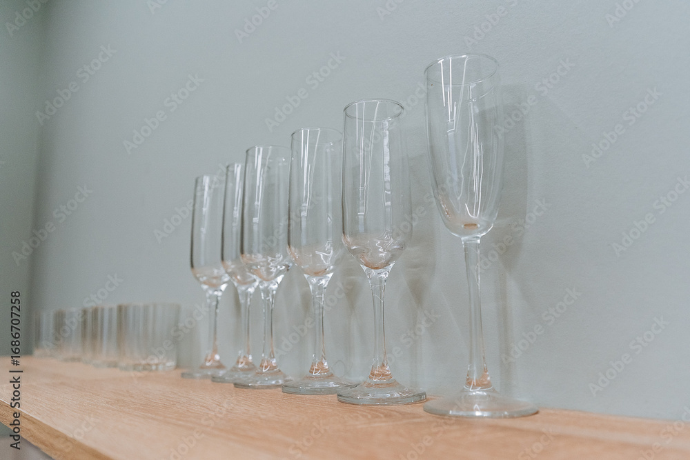 This piece showcases an elegant and meticulously curated arrangement of glassware placed delicately on a charming wooden shelf, making for a sophisticated backdrop for any occasion