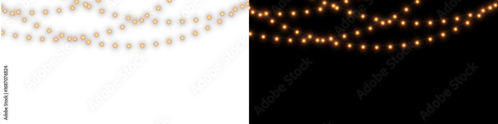 Realistic glowing Gold LED garland on a transparent background. Ideal PNG decoration for holiday cards, festive banners, or Christmas and New Year celebration designs. Web Banners