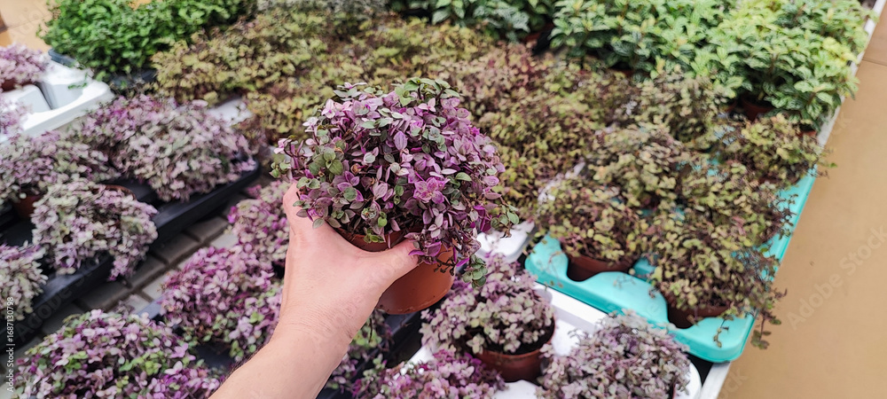 Close-up of a hand holding a small decorative plant in a pot at a nursery. Concept: indoor gardening, retail plant display, and plant care.