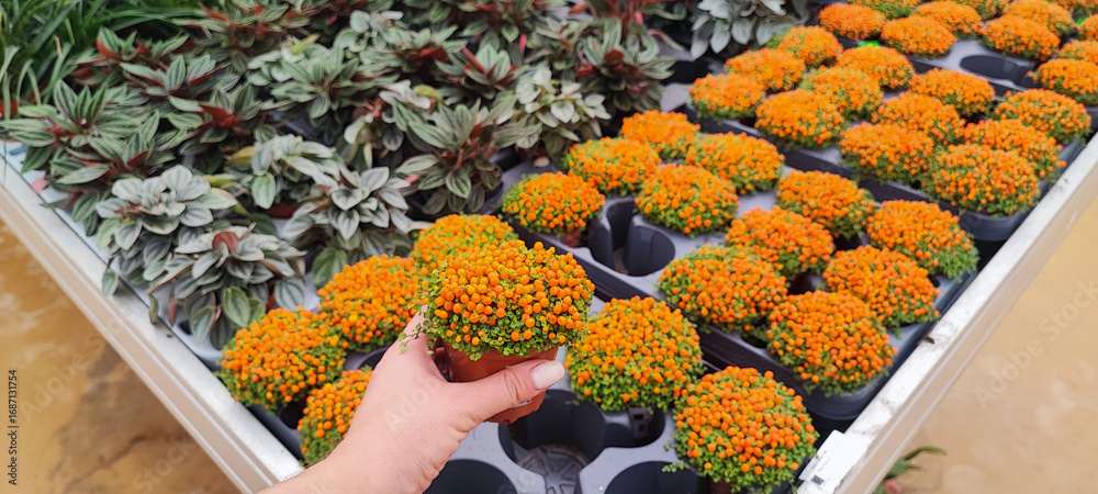 Close-up of a hand holding a small decorative plant in a pot at a nursery. Concept: indoor gardening, retail plant display, and plant care.
