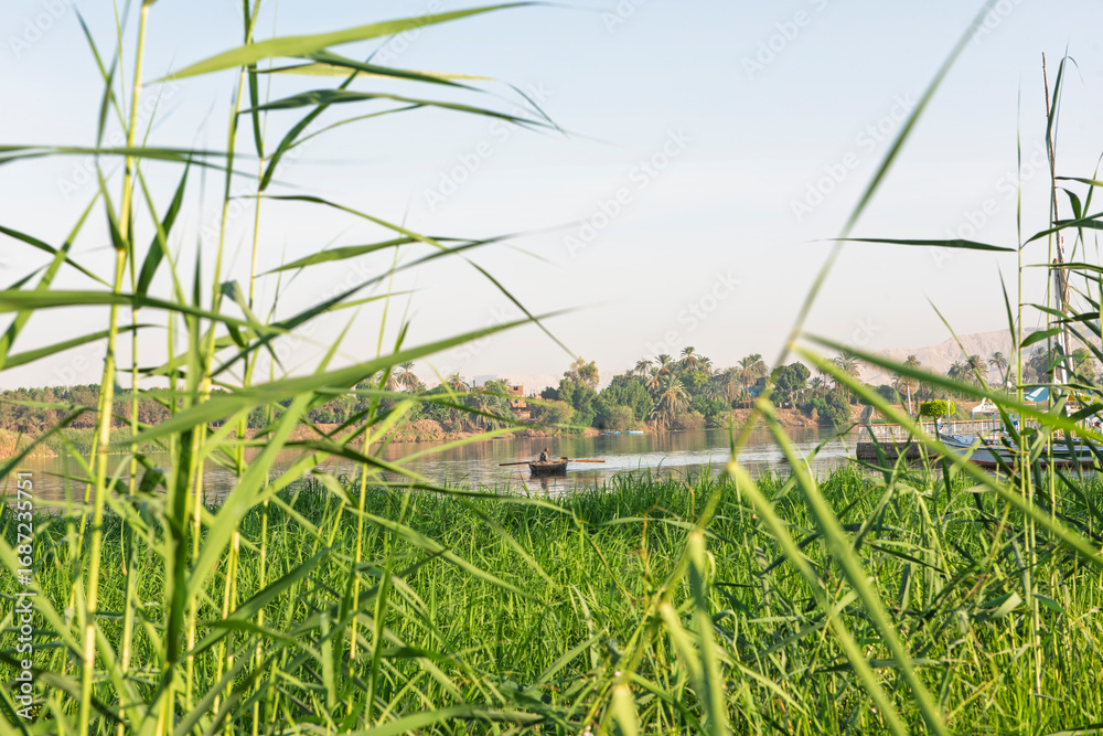 Panoramic landscape view across large river in africa with grass reeds in foreground