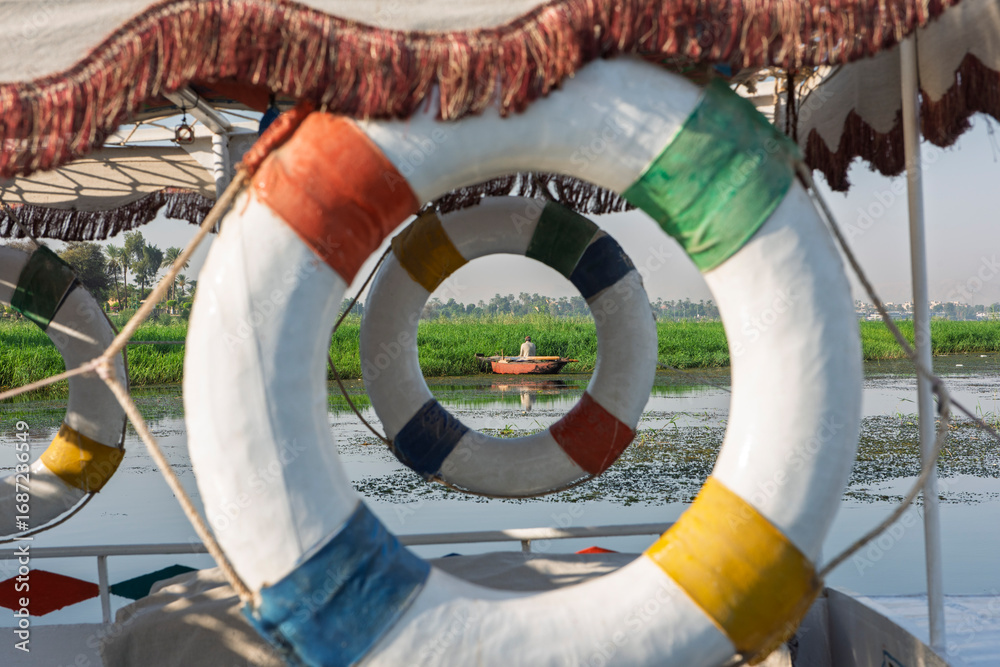 Abstract view of traditional egyptian bedouin fisherman in rowing boat on river Nile fishing by riverbank through life ring buoys