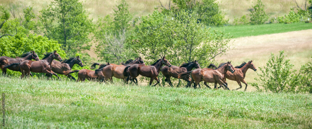Panoramic image of juvenile Thoroughbred horse yearling herd on grass ridge overlook