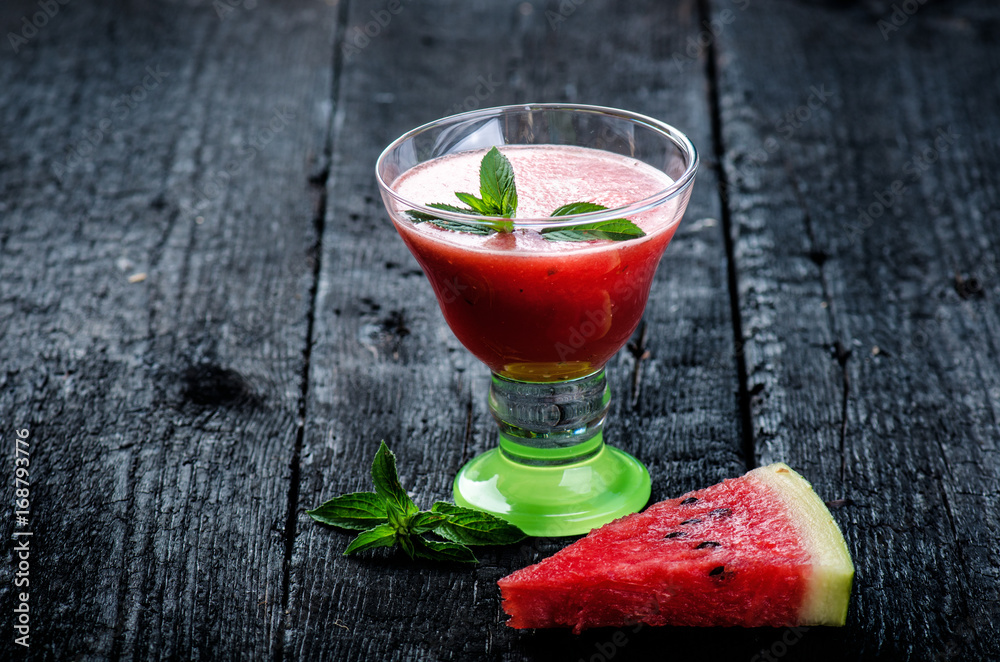 Water melon cocktail with slices of fresh melon on a wooden burnt table with ice cubes. Black natural background. Healthy drink. Summer cocktail