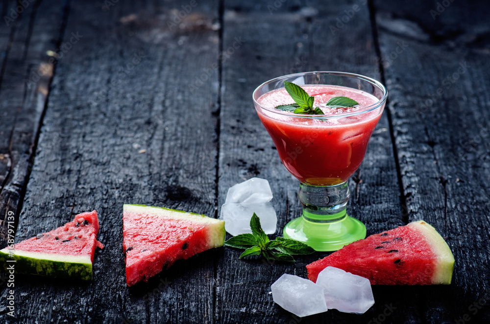 Water melon cocktail with slices of fresh melon on a wooden burnt table with ice cubes. Black natural background. Healthy drink. Summer cocktail