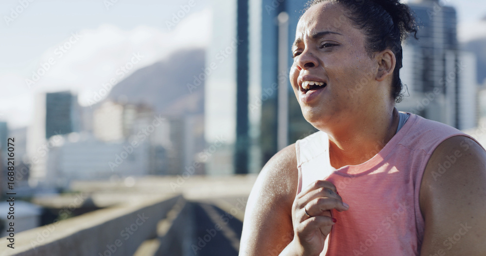 Woman, fitness and tired from running in city for health, cardio endurance and sweating. Breathing, recovery and plus size runner with intense workout to lose weight, space and exercise from training