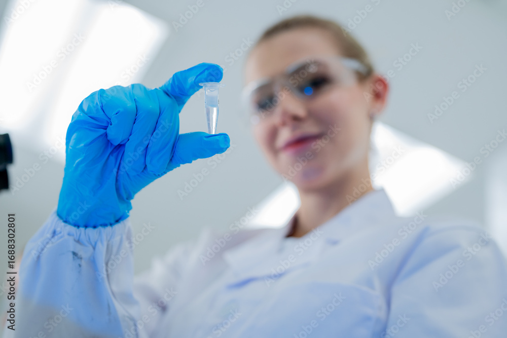 Scientist holds a sample vial while conducting research in a modern laboratory environment