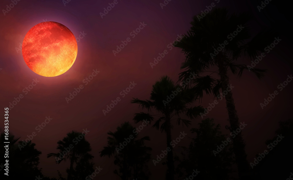 Halloween image show bright full blood moon with creepy dark sky and silhouette of trees in the forest. Image use for Halloween presentation festive background.