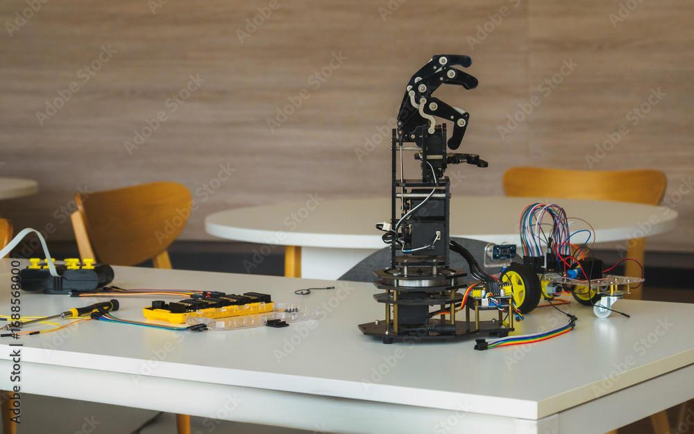 Modern education on classroom for student, interested people robotics workspace with various components and tools on white table, showcasing innovation and technology in a well-lit environment.