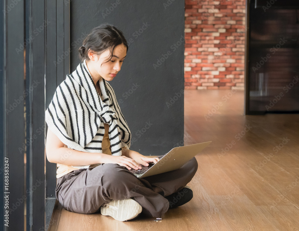 Young woman sits on floor next large window, writing laptop. wear sweater. greenery outside window creates calm and focus study environment, ideal for portraying self-learning knowledge education.