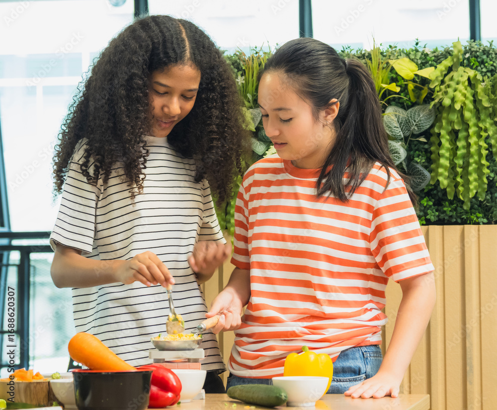 Group two children prepare healthy meal together in bright, modern kitchen. Surrounded fresh vegetable like bell pepper broccoli carrot engage in fun and education cook activity. creating vibrant