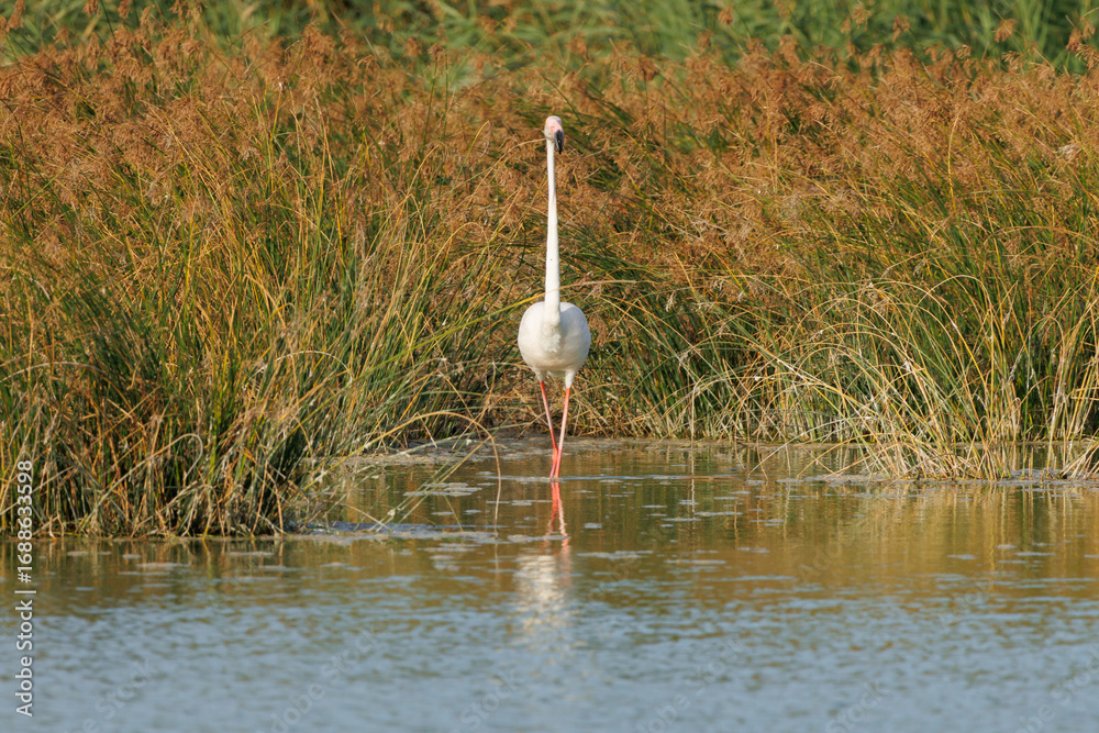 Flamenco común Phoenicopterus roseus mirando a cámara rodeado de cañas en su hábitat natural del parque natural el Hondo, España