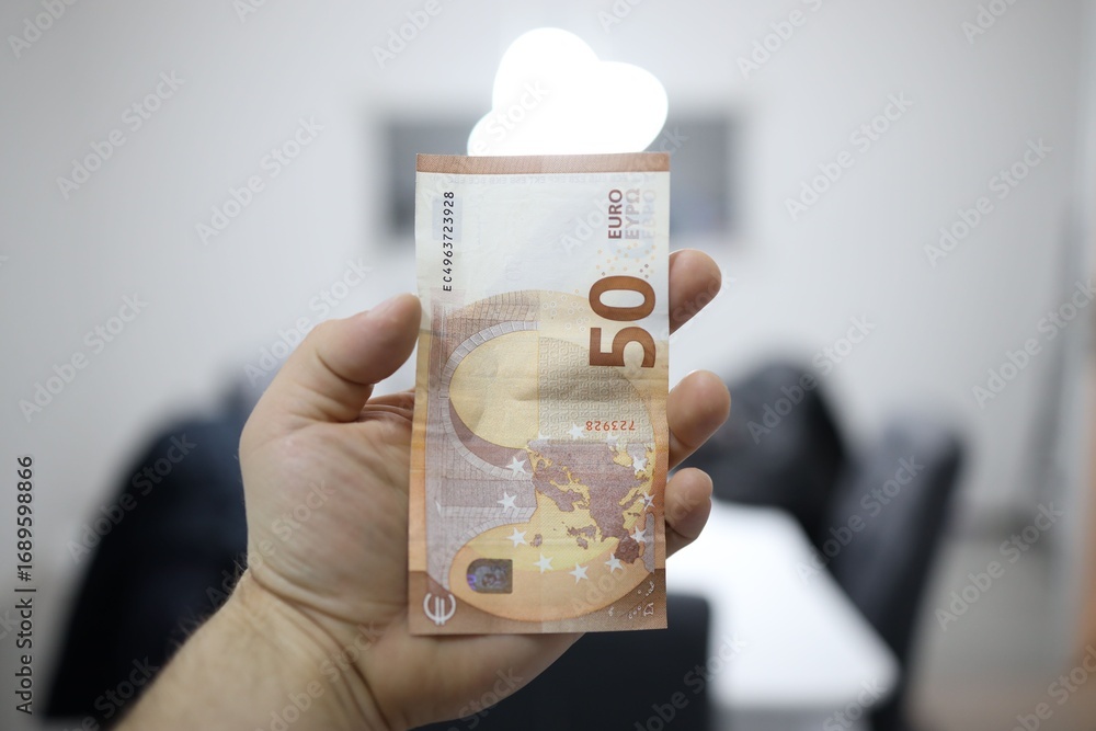 Person holding a 50 euro banknote indoors.