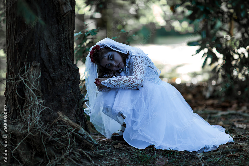 A girl in a scary bride costume,zombie makeup for Halloween