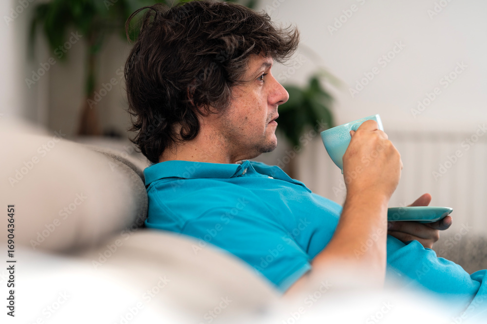 Man Drinking from Teacup on Sofa in Modern Living Room. coffee
