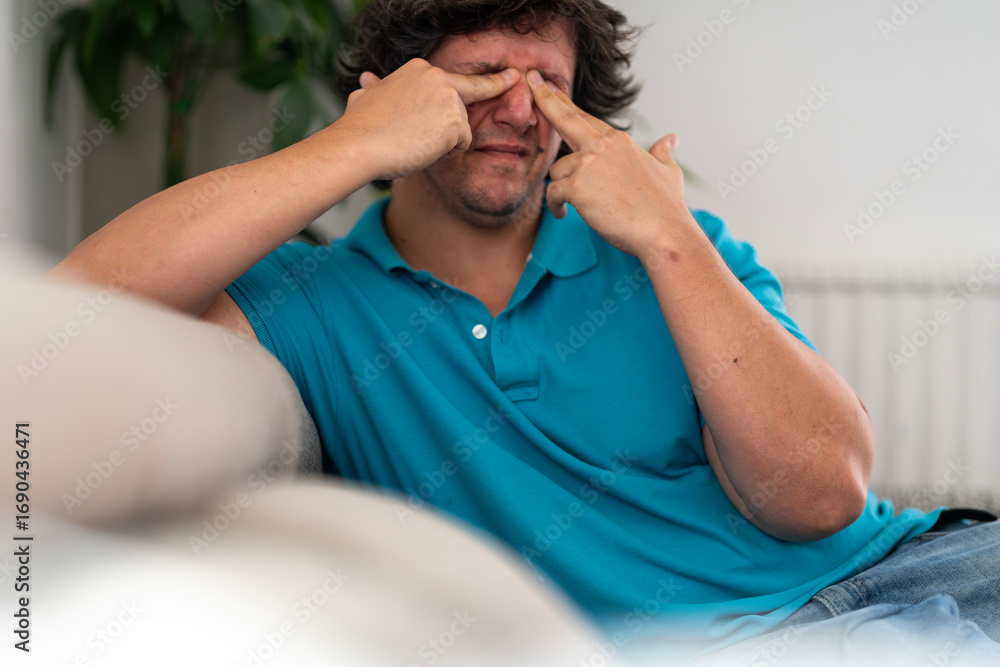 Exhausted Man Rubbing Eyes in Frustration on Sofa in Modern Living Room