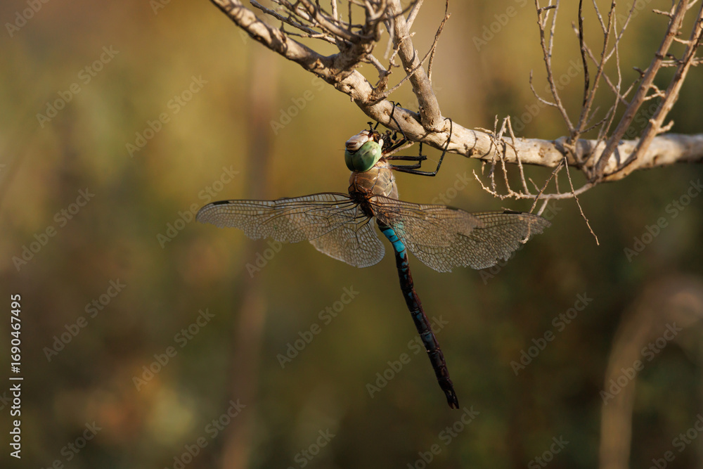 Libélula emperador Anax imperator posada en una rama de arbusto del parque natural el Hondo, España