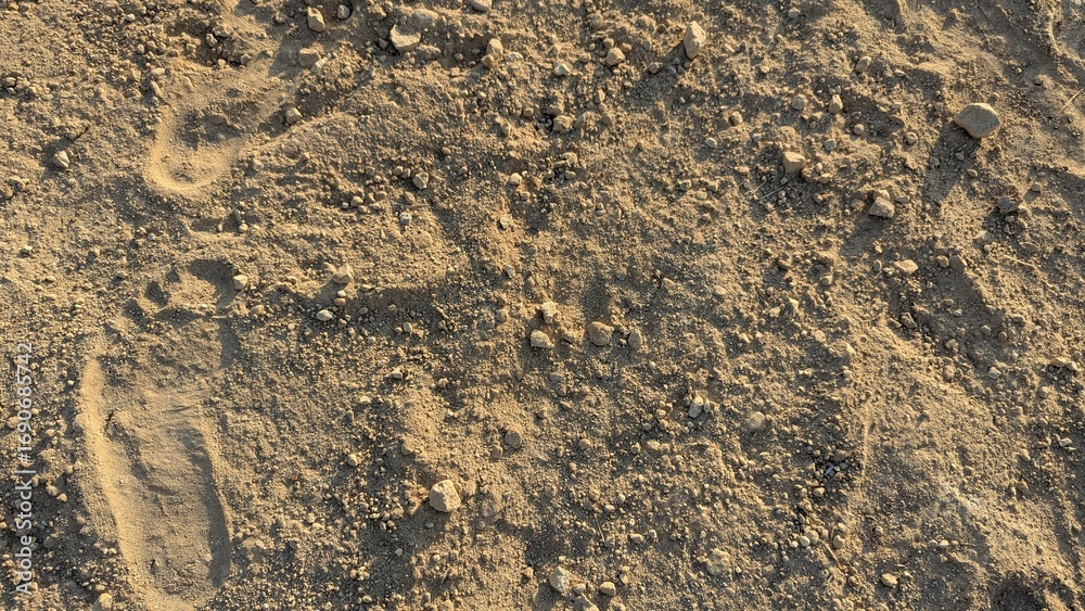 A top-down, detailed shot of dry brown dirt and pebbles. The surface is uneven and textured, with footprints and small impressions visible on the left side, adding a sense of recent activity.